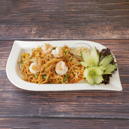 gebratene Reisbandnudeln mit Ei, Sojasprossen und Erdnüssen